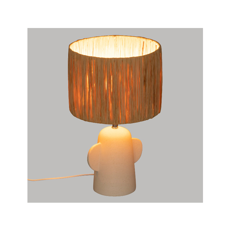La lampe se distingue par son pied en céramique doté d'un fini brut et de ses oreilles rondes. Par ailleurs, l'abat-jour est en métal recouvert de raphia tissé. Ce mélange de matières naturelles s'inscrira à merveille dans une décoration de caractère.