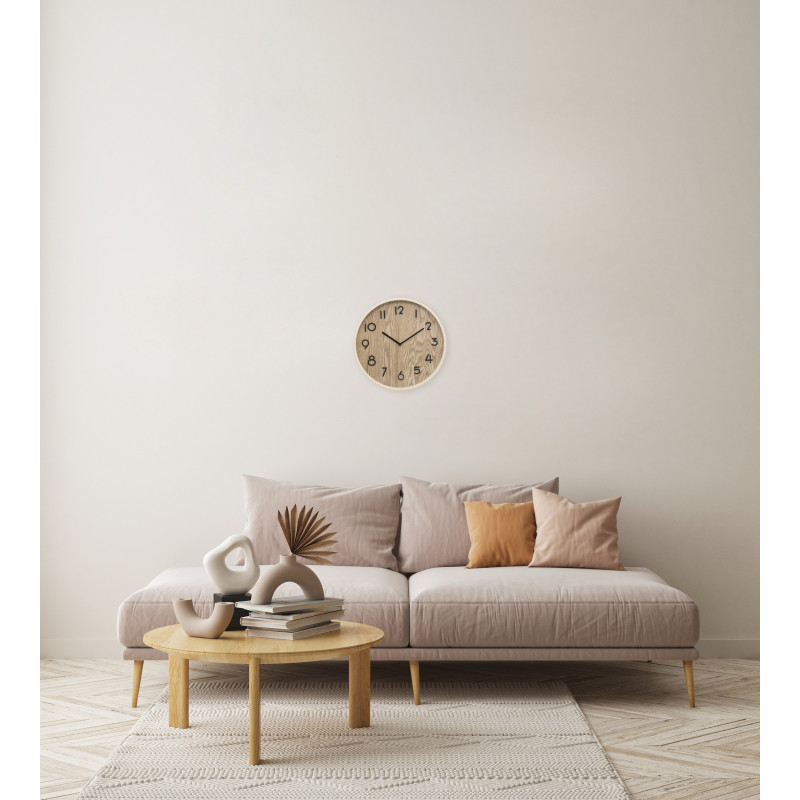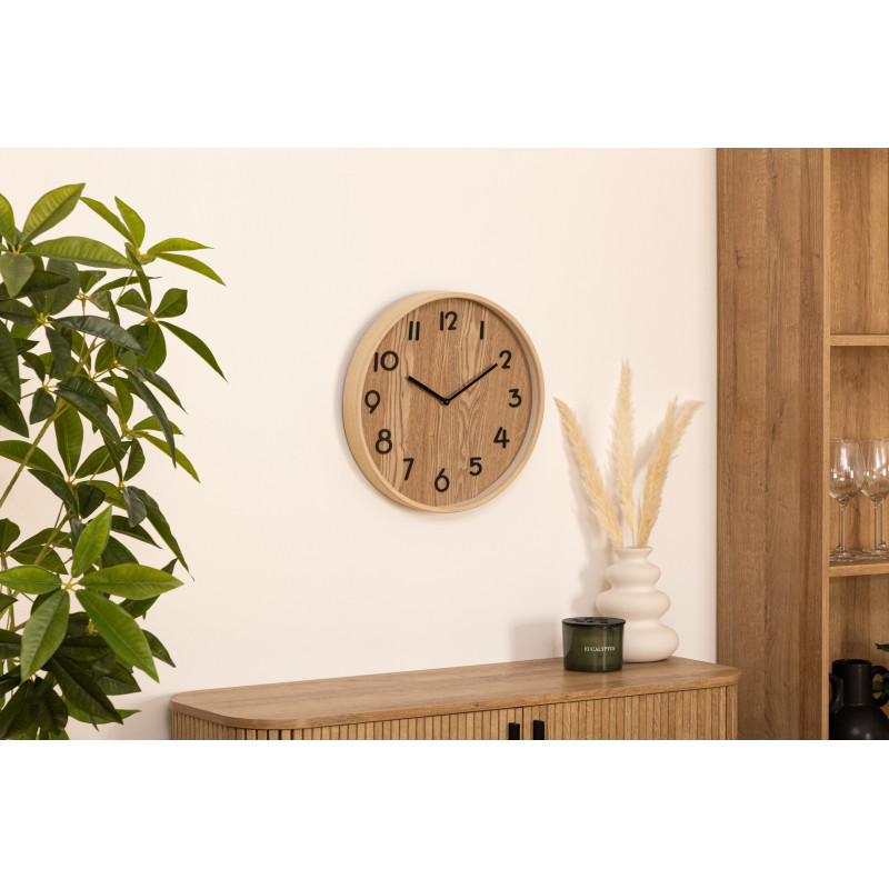 L'horloge obéit à une forme classique et se distingue par son cadre en bois clair. Vitrée, elle est agrémentée de chiffres et d'aiguilles en métal, en toute simplicité ! Vous pourrez la placer dans une entrée, une cuisine ou une pièce de vie en la coordonnant à des matières comme le rotin.