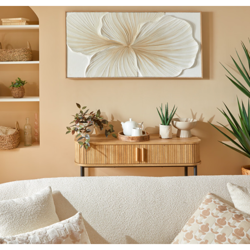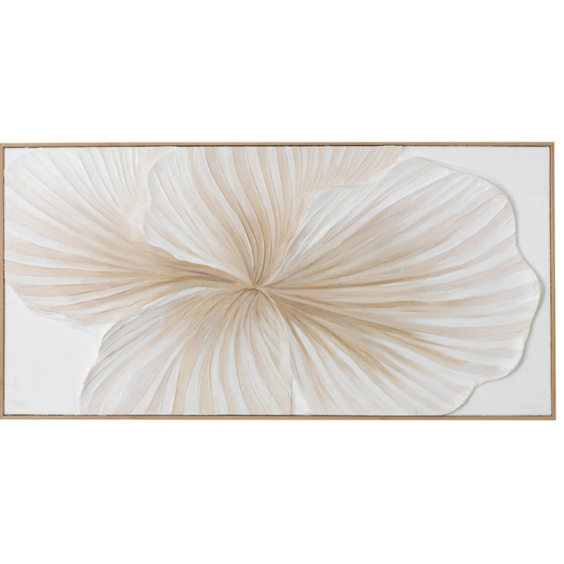 Tableau 3D fleur beige/blanc cadre bois 58x118