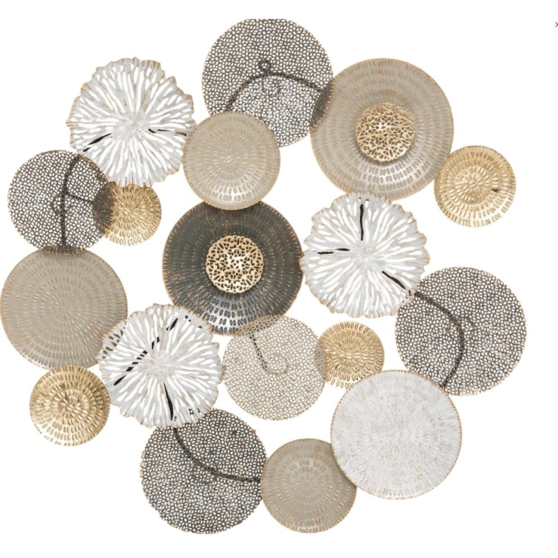 Composée d'une multitude de disques en métal de différentes tailles et textures reliés entre eux par un fil, la déco murale se pare de finitions métallisées pour mieux illuminer votre intérieur. Filigrane, découpes, reliefs, la sculpture murale semble sortir de l'atelier d'un artisan d'art.