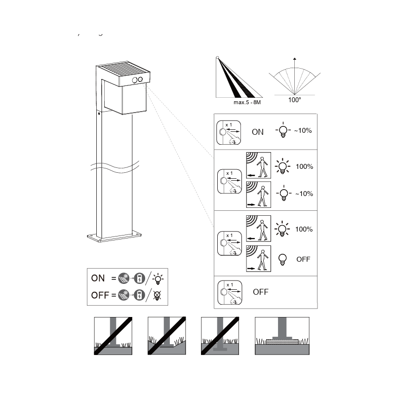 Assurez une sécurité suffisante le long des chemins ou de l'allée menant à la maison dans l'obscurité. Pour un éclairage optimal, l'éclairage extérieur LED moderne est équipé d'un détecteur de mouvement qui a un angle de détection de 100 degrés et une portée de 5 à 8 mètres.