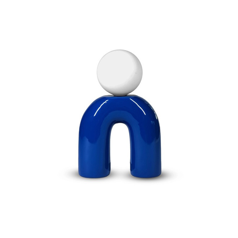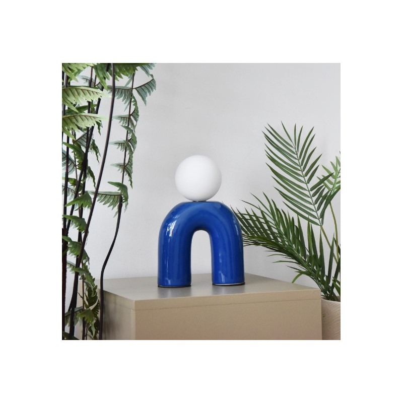 Son design ludique en forme de personnage stylisé — base en U laquée bleu profond + globe lumineux blanc — apporte une touche à la fois graphique, fun et ultra contemporaine à n’importe quelle pièce.